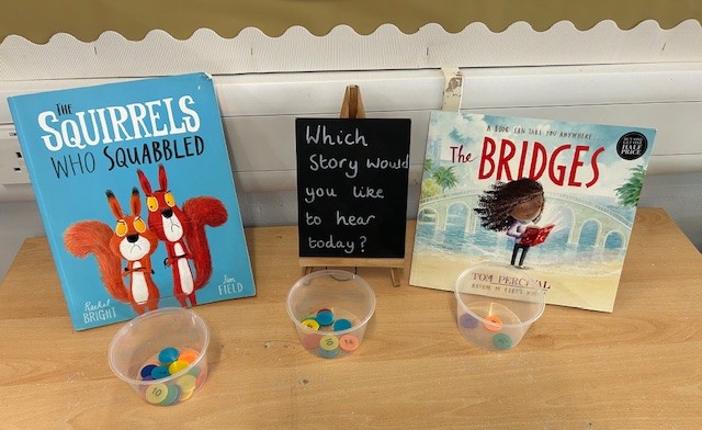 Every morning we choose which story we would like to read together. We get to vote!